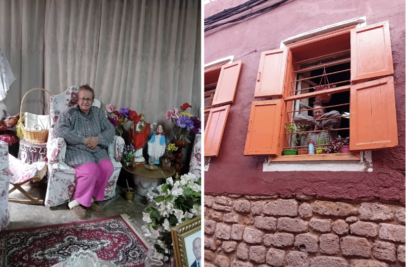 من أحد الشبابيك أطلت سيدة مرحّبة بنا ودعـتنا لاستراحة في منزلها. دخلنا بهوًا إلى صحن الدار، ثم صعدنا درجًا حجريًّا الى المنزل الذي لا يزال سطحه خشبيا ومن الطين المدحول. جلسنا على أريكة بين الأيقونات وصور القديسين وأفراد العائلة." لا يزال لديّ أخوان يقيمان هنا في الحارة ، وثلاثة أخوة هاجروا إلى استراليا" . تقول لنا المضيفة سيسيليا برادعي. وتضيف "لم أترك المدينة أبدا ، نحن مرتاحون هنا في كل الأوقات على الرغم من الوضع المعيشي الضيق. كنت قبل الحرب الأخيرة أرى أفواجًا من السياح يمرون من تحت نافذتي ، وأسمع لغات من مختلف بلدان العالم. اليوم غابت هذه الحركة التي نشتاق إليها. وبعد أن لاحظت اهتمامنا بطراز البيت القديم ، أخبرتنا أنها تعرف من والديها وجدودها أن عمر البيوت في " الحارة " تتجاوز المئتي عامًا . ويكتمل الشكل التراثي للمنزل، مع شكل الأثاث والمطرزات المزركشة التي تغطيه، حتى لباس السيدة التقليدي.