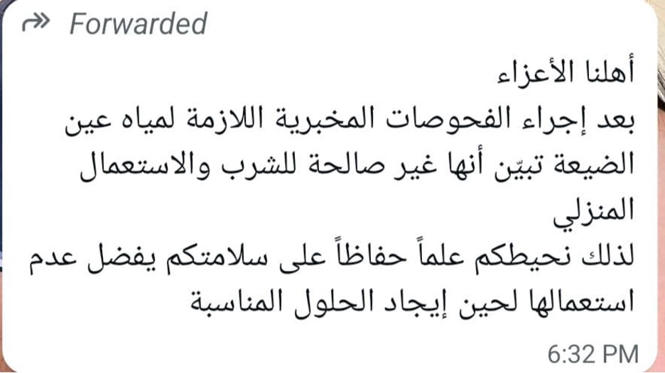 ويضيف "آخر فحص أظهر أن المياه غير صالحة للشرب أو الطبخ أو الزراعة، لذلك طلبنا من الأهالي التخفيف من استخدامها". ويشير إلى أنّ الاستجابة لم تكن واحدة، موضحًا أن "الأهالي الذين يقيمون خارج البلدة الذّين كانوا يحملون المياه إلى بيروت خفّفوا استعمال المياه بشكل أكبر، فيما لا يزال معظم المقيمين داخلها يعتمدون عليها في حياتهم اليومية".