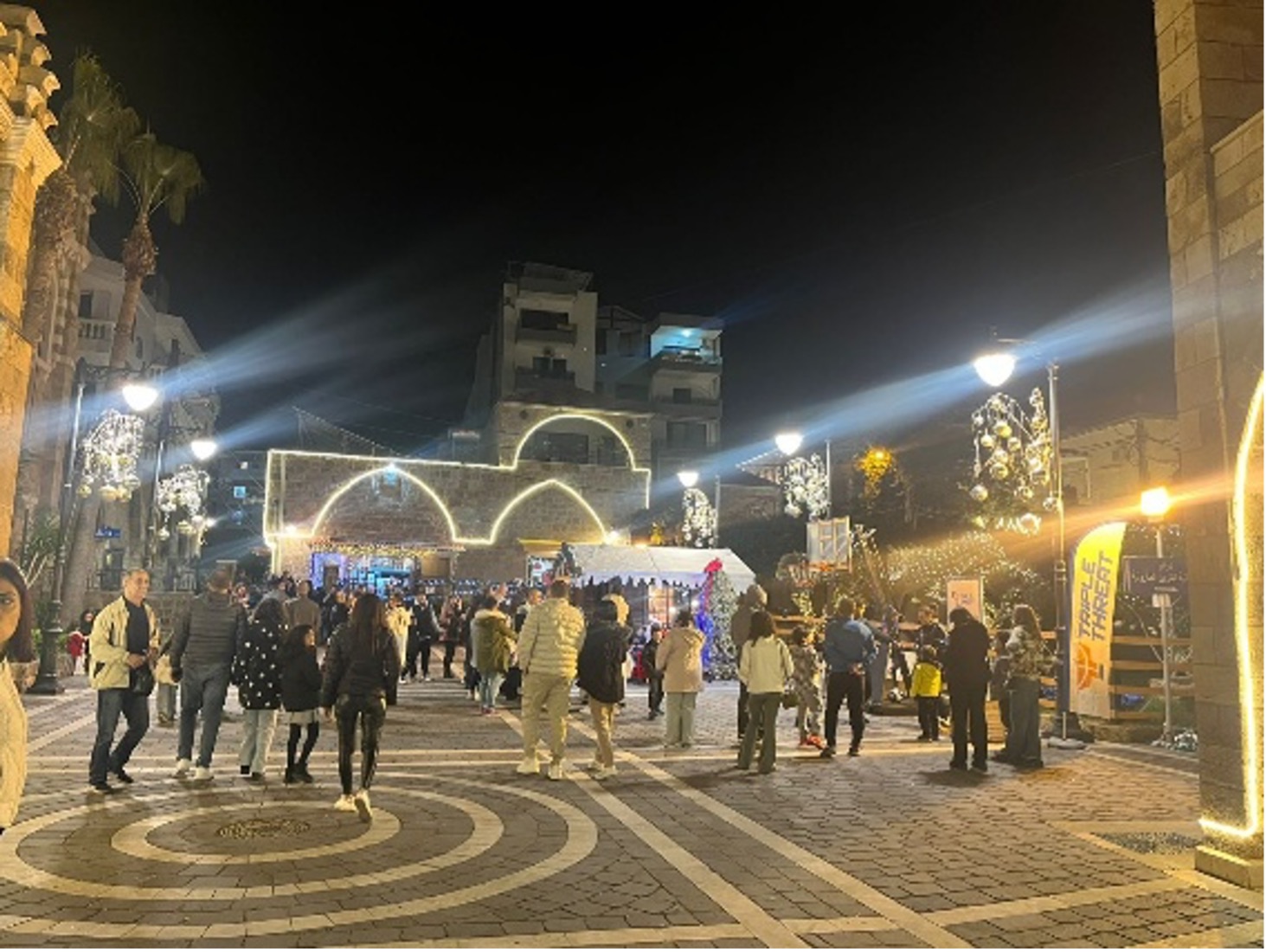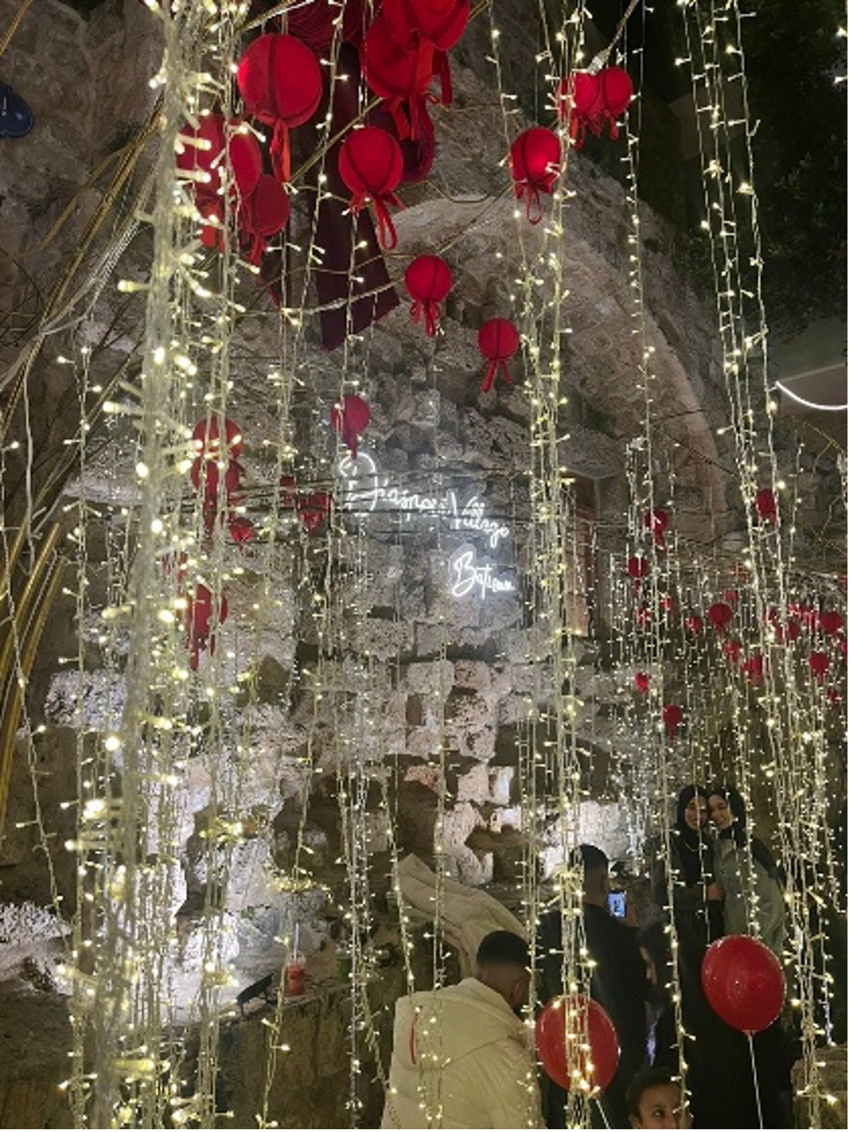 33.jpg270.4 KBوعلى الجدار الخارجي لكنيسة مار اسطفان، يُقدَّم عرض ضوئي يروي قصة الميلاد باستخدام الأضواء. مدّة العرض نحو خمس دقائق، ويتكرّر يوميًا عند الساعة السادسة، السابعة، الثامنة، التاسعة، والعاشرة مساءً، فيتجمّع الناس لمشاهدته بإعجاب في كل مرة.
